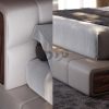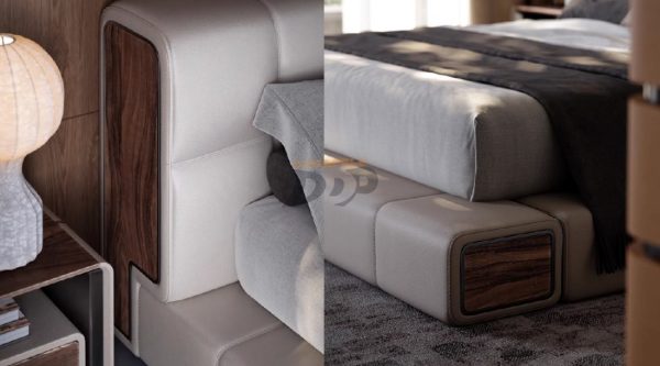 Modelul prezentat este compus din pat la care este inclus suportul de saltea. Suprafata tabliei este confectionata din piele naturala, lateralele patului si noptierele sunt acoperite cu piele ecologica. Elementele de imbinare si feronerie sunt de cea mai bună calitate, produsul fiind construit cu o atentie deosebita, desavarsit in fiecare detaliu. Suportul de saltea este din metal cu lemn stratificat.